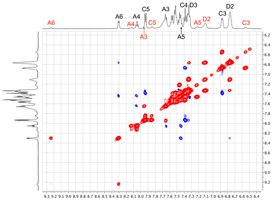 EXSY (red) and NOESY (blue) cross-peaks in the aromatic region of the ROESY spectrum of [Cu(xantphos)(tBuSPy)][PF6] (500 MHz, acetone-d6, 198 K). Major species represented by black labels, minor by red labels. See Materials and Methods Section for full assignment of major species.