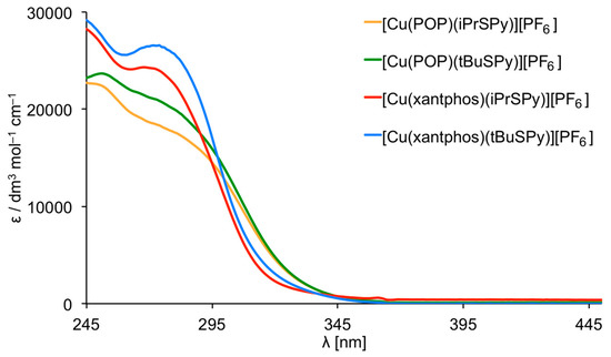 Figure 9 displays the solution absorption spectra of the [Cu(P^P)(N^S)][PF6] complexes. For comparison, the absorption spectra of the N^S ligands are shown in Figure S16; the absorption spectra of POP and xantphos have previously been reported [31]. The compounds are colourless, and the intense high-energy absorption bands (Table 2) are assigned to ligand-based, spin-allowed π*←π and π*←n transitions. The compounds are non-emissive in solution, and solid samples excited at 280 nm gave emission maxima between 470 and 490 nm (Table 2 and Figure S17), blue-shifted with respect to the reference compounds [Cu(POP)(bpy)][PF6] and [Cu(xantphos)(bpy)][PF6] (λemmax = 581 and 587 nm with λexcitation = 365 nm [13]). The solid-state photoluminescence quantum yields (PLQY) are <2% (Table 2), which is significantly lower than for many [Cu(P^P)(N^N)][PF6] compounds, for example [13,27,29,30]. However, it is important to note that PLQY values for [Cu(POP)(bpy)][PF6] and [Cu(xantphos)(bpy)][PF6] are also low in the solid state (3.0% and 1.7%, respectively [13]), and that enhancement of PLQY is only achieved by tuning the substitution pattern of the bpy ligand [13,27,29].