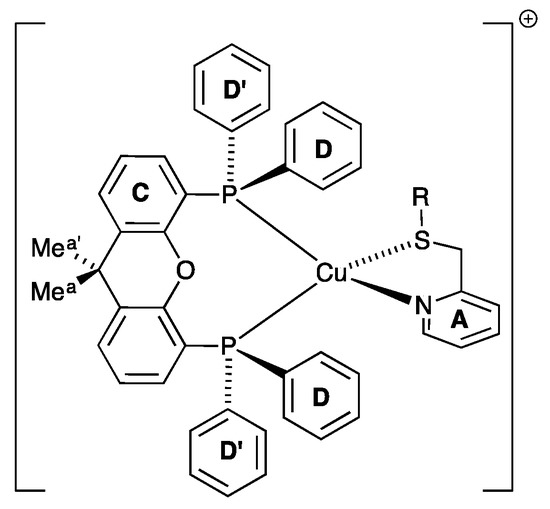 Inequivalence of the phenyl rings in each PPh2 group and of the xantphos methyl groups in [Cu(RSPy)(xantphos)]+. A similar inequivalence occurs in [Cu(RSPy)(POP)]+.