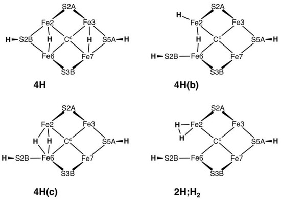 A species identified as E4H4 in the Thorneley–Lowe scheme can be trapped at 77 K [53]. ENDOR spectroscopy indicated that two of the H atoms occur as Fe–H–Fe bridges [54,55]. Accordingly, I have explored these possibilities, and the resulting structures are presented in Figure 9b. The first four structures contain both 26-H and 37-H bridges across opposite edges of the front Fe4 face. Of these, the symmetrical 4H.2x.6x.26.37 has H atoms bound only to Fe, while 4H.26.37.2b.3b2 has two Fe–H–Fe bridges and two H atoms bound to S. Three structures, 4H.2x.26.67.3b2, 4H.6x.26.67.3b2 and 4H.26.67.2b.3b2 contain both 26-H and 67-H bridges, and necessarily also contain 3b2 to accommodate the 67-H bridge. Structure 4H.26.67.2b.3b2, like 4H.26.37.2b.3b2, has two Fe–H–Fe bridges and two H atoms bound to S.