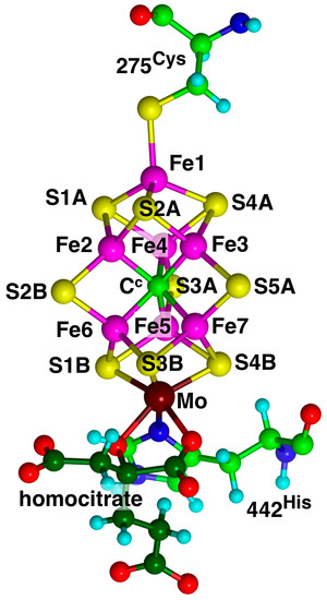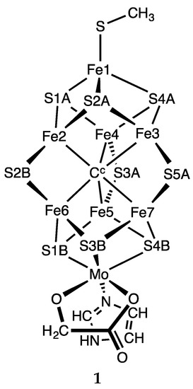 The enzyme nitrogenase naturally catalyses the conversion of N2 to NH3, concurrently with some reduction of protons to H2 [1,2,3,4,5,6,7,8]. This enzyme has a broader capacity to hydrogenate unnatural substrates and can be regarded as a general hydrogenator of small molecules [9]. The enzyme comprises two proteins, the Fe protein and the MoFe protein. The catalytically active site is the FeMo-co cluster, with composition Fe7MoS9C(homocitrate), located in the MoFe protein [10]. The structure and atom-labelling of FeMo-co are shown in Figure 1.