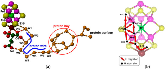 (a) The chain of water molecules (orange) extending from the protein surface to S3B of FeMo-co. Broken lines are hydrogen bonds. (b) The H atom (black) migration pathways (red) around S3B and then to H atom binding sites on FeMo-co.