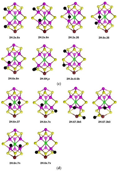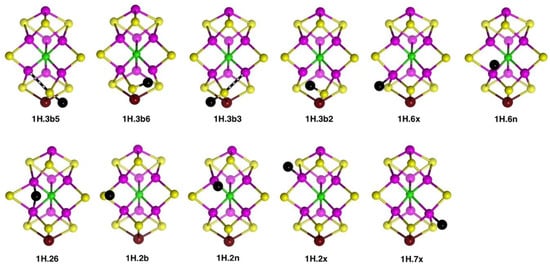 The second group (shown in Figure 9a) contains structures with H atoms on S2B, Fe6 and S3B, but not Fe2. In four of these, 4H.6x.26.2b.3b5, 4H.6x.26.2b.3b6, 4H.6x.26.2b.3b3 and 4H.6x.26.2b.3b2, there is a 26-H bridge, usually asymmetric towards Fe6, while in 4H.6x.6n.2b.3b2 that bridge has moved to the 6n position, and in 4H.6x.67.2b.3b2 it forms a 67-H bridge, with the required large distortion of the S3BH group. There is no elongation of Cc–Fe distances in any of the structures in this group.