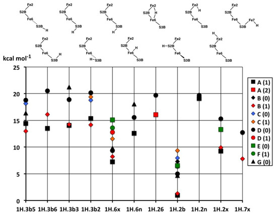 The relative energies of all structures in their more stable electronic states are graphed in Figure 4. The principal result is the highest stability of the structure 1H.2b throughout its electronic states. The next most stable structures are those with H atoms exo coordinated to Fe, 1H.6x, 1H.2x, 1H.7x. In general, these are about 6 kcal mol−1 less stable that 1H.2b in the corresponding electronic state. Ryde et al. calculated (with the TPSS functional) this energy gap from 1H.2b to 1H.6x, 1H.2x and 1H.7x as 8 to 11 kcal mol−1 [52]. Structures with H in the endo or bridging positions (1H.6n, 1H.2n, 1H.26) are roughly 12 kcal mol−1 less stable that 1H.2b. Exo coordination of H at Fe is always more stable than endo. Finally, the structures with H bonded to S3B are ca. 11–14 kcal mol−1 less stable than 1H.2b. One instance of Fe–Cc isomerism occurs in this collection of structures: 1H.2x/D(0) exists in one form with an Fe2–Cc bond of 2.32 Å (trigonal pyramidal coordination of Fe2), and another without that bond, Fe2–Cc = 3.05 Å (tetrahedral coordination of Fe2): the relative energies are +15.3, +9.2 kcal mol−1 respectively. Three species (1H.3b3, 1H.3b2, 1H.6x) each occur as “spin-isomers”, in two different D(0) electronic states which differ in the magnitudes but not signs of the spin densities.