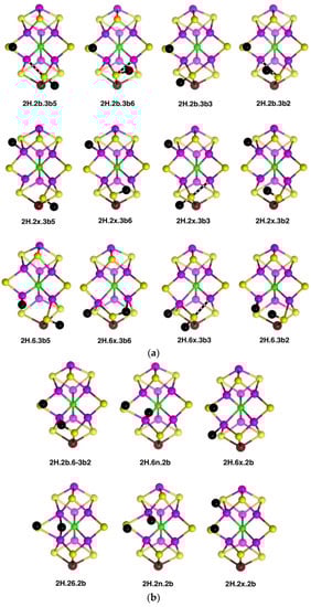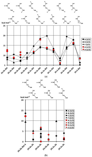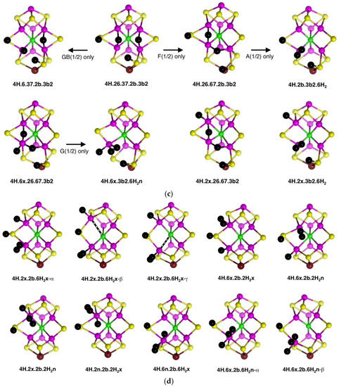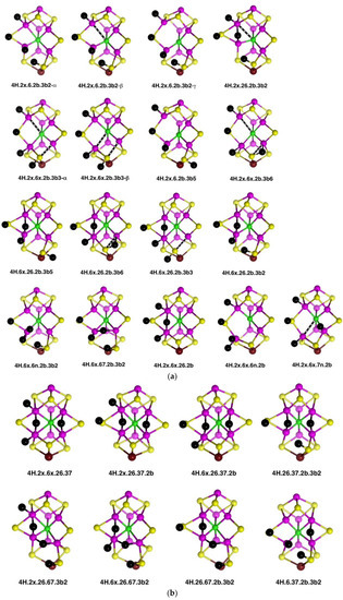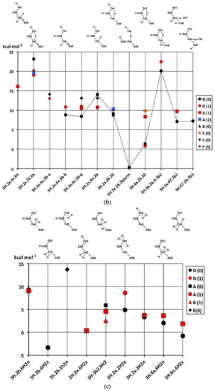 Finally, in this group (Figure 10b), the products of the H2-forming transformations, 4H.2b.3b2.6H2, 4H.6x.3b2.6H2n and 4H.2x.3b2.6H2, are clearly more stable, in the range of +3 to +7 kcal mol−1.
