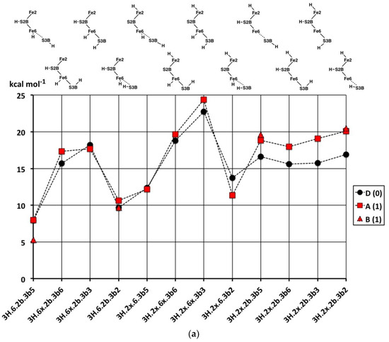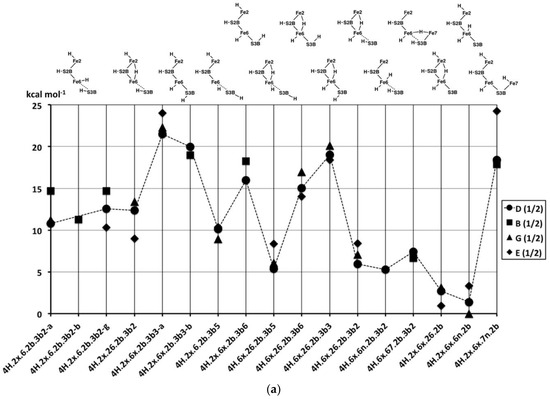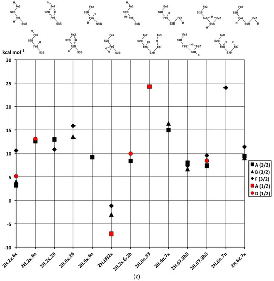 The relative energies of the 2H structures, presented in Figure 6, span a range of 30 kcal mol−1. In general, the energies of the best calculated electronic states of each structure range about 5 kcal mol−1, and there is no general energy differentiation of the S = 3/2 (experimental) states (black symbols) and S = 1/2 states (red symbols). The main description of relative energies is according to structure. To aid comprehension, the sequence of structures in Figure 6 is the same as the sequence of structural pictures in Figure 5. Energies for the three sets of four structures with various S3B–H conformations (Figure 5a) are plotted in Figure 6a. The four structures in the 2H.2b.3b5-6-3-2 series are approximately equally stable, which is significant in the context of H atom migration on FeMo-co. The H atom enters via the 3b5 intermediate and usually moves to Fe6 via the 3b2 intermediate, passing through either the 3b3 or the 3b6 intermediates [66], which, therefore, should not have higher energies. The four structures in the 2H.2x.3b5-6-3-2 series, are less stable than the 2H.2b.3b5-6-3-2 counterparts and have increased energies for the 3b3 and 3b6 intermediates. The four structures in the 2H.6x.3b series have more pronounced energy variations. The favourable energies for 2H.6x.3b5 and 2H.6x.3b2 are attributable to the retention of tetrahedral four coordination at Fe6 in both: this four coordination of Fe6 is compromised in 2H.2b.3b5, 2H.2x.3b5, 2H.2b.3b2 and 2H.2x.3b2. The high energies of 2H.6x.3b3 and 2H.6x.3b6 would clearly disfavour migration of H around S3B when the other H atom is on Fe6.