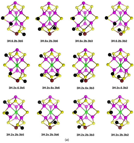 The thirty-three stable structures that were identified are displayed in Figure 7. First, there are three sets of structures with the four conformations of S3BH combined with the other two H as 2b plus 6x, 6x plus 2x, and 2b plus 2x (Figure 7a). These structures are comparable with the analogous 2H structures and do not introduce any new principles. The coordination at Fe6 is threefold in 3H.2x.2b.3b5 and 3H.2x.2b.3b2, fivefold trigonal prismatic in 3H.6x.2b.3b6, 3H.2x.6x.3b6 and 3H.2x.6x.3b3, and fourfold tetrahedral in the others.