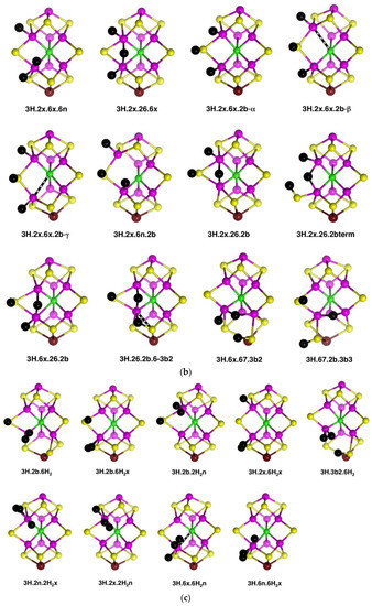 The nine stable structures containing bound H2 in endo or exo coordination positions are shown in Figure 7c. Four have H and H2 bound to the same Fe atom. Structure 3H.3b2.6H2 has the H atom on S3B directed towards the H2 molecule on Fe6, with H–H2 contacts in the range of 2.0 to 2.5 Å (depending on the electronic state). The binding of H2 is generally weak, and some putative structures/electronic states are unstable to dissociation of H2. These are 3H.2x.6H2x/D(0), 3H.2b.6H2x/A(1), 3H.2b.6H2x/B(1), 3H.2b.2H2n/D(0), 3H.2b.2H2x/B(1), and 3H.2b.2H2x/D(0). At this point, I comment that the BLYP functional with numerical basis sets, as used here, is known to underbind slightly. H2 dissociation energies calculated with functional PBE are slightly larger and closer to experimental data [69]. Therefore, the details of which hydrogenated structures dissociate H2 and which do not are inconclusive here. However, there is no uncertainty about the relative weakness of H2 binding to FeMo-co. Further information will be presented in the next paper, dealing with reaction profiles.