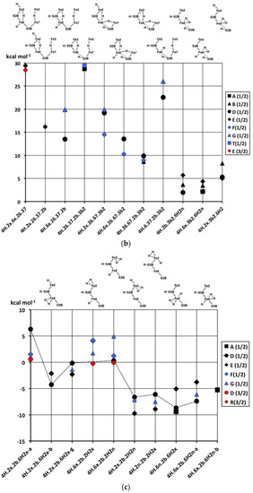 Relative potential energies (kcal mol−1) of the optimised structures with 4H or 2H + H2 bonded to FeMo-co, in their best electronic/spin states. (a) Energies for the sequences of structures in Figure 9a. (b) Energies for the sequences of structures in Figure 9b,c. (c) Energies for the sequences of structures in Figure 9d. The three parts have the same energy reference. The tie lines are included only as a visual guide.