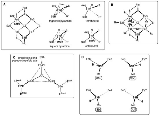 There are four stable conformations for an H atom bound to S3B, shown in Scheme 1 panel D. In each of these S3B has pyramidal three-fold coordination, because one of the S3B–Fe interactions is elongated (usually to more than 2.7 Å). Details of these conformations and of their inter-conversions have been published [66]. The labels 3b2, 3b3, 3b5 and 3b6 (panel D) are used in the naming of structures containing these conformations of S3B–H.