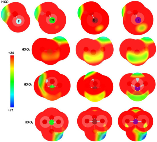 Molecular electrostatic potential (MEP) on the 0.001 a.u. electron density isosurface of the halogen oxoacids. Energy values in kcal·mol−1.