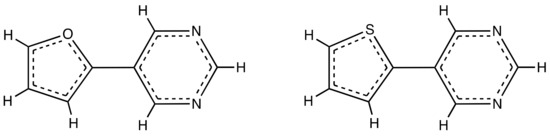 Here, we explore the effects of the addition of either a furan or thiophene group on the vibrational frequencies of the halogen bond acceptor pyrimidine, and we assign normal modes in these molecules for the first time. The two molecules of interest, 5-(furan-2-yl)pyrimidine (denoted PrmF) and 5-(thiophen-2-yl)pyrimidine (denoted PrmT), are shown in Figure 1. We also construct co-crystals with a previously introduced halogen bond donor, and compare the resulting pairwise interactions to those in other previously described systems [18,19].
