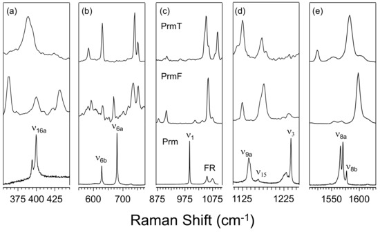 Figure 2 compares the experimental solid-state Raman spectra of pyrimidine (Prm) to that of its furan (PrmF) and thiophene (PrmT) analogues in the fingerprint region (≤1700 cm−1). We previously characterized the effects of noncovalent interactions on ten normal modes of pyrimidine in the region [42,43,44,45], and Figure 3 compares the Raman spectra in regions of these modes in greater detail. The C–H stretching region is not considered here because of the congestion of the modes. It is evident from Figure 2 and Figure 3 that, when compared to Prm, the vibrational spectra of PrmF and PrmT exhibit additional peaks because of the motions involving furan and thiophene, and also the peaks originating from the frequencies that have shifted upon the addition of the furan and thiophene groups. The features in the regions of interest in the derivatives also suffer from low signal to noise in some cases.