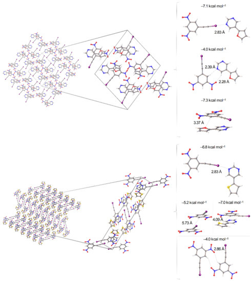 A structural analysis similar to that performed on the (NO2)2BAI-PrmF co-crystal was carried out on the experimental (NO2)2BAI-PrmT co-crystal (bottom panel in Figure 4; Figure S4 and Table S23). In this case, an added complexity in the form of the crystallographic disorder of the thiophene moieties leads to a greater number of unique pairwise contacts. Homogenous interactions formed between either two (NO2)2BAI donors or two PrmT acceptors make up 12 of the 28 pairwise contacts identified, and consist of slipped-stack ( = −0.8 kcal mol−1 to −3.7 kcal mol−1), antiparallel ( = −0.7 kcal mol−1 to −1.6 kcal mol−1), and t-shaped ( = −2.8 kcal mol−1 to −3.1 kcal mol−1) π-type interactions, as well as a hydrogen bonding interaction ( = −4.0 kcal mol−1). The remaining sixteen heterogenous pairwise contacts include strong halogen bonding ( = −6.8 kcal mol−1) and π-stacking interactions ( = −7.0 kcal mol−1 to −7.2 kcal mol−1), along with weaker perpendicular π-type interactions ( = −1.2 kcal mol−1 to −3.0 kcal mol−1) and hydrogen bonding interactions ( = −0.6 kcal mol−1 to −3.1 kcal mol−1). The two strongest hydrogen bonding interactions (with near −3 kcal mol−1) involve not only a Hdonor···NPrm contact, but also an interesting contact between an acidic proton of the pyrimidine moiety, and the π electrons in the C≡C bond connecting the I atom to the benzene ring. The other hydrogen bonding interactions present in the (NO2)2BAI-PrmT co-crystal exhibit values that are weaker (less negative) by approximately 1 to 2 kcal mol−1. Although these intermolecular interactions are relatively weak, the same cannot be said for the π-stacking ( = −7.0 kcal mol−1 to −7.2 kcal mol−1) and halogen bonding interactions ( = −6.8 kcal mol−1).