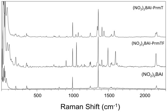 Experimental Raman spectra of (NO2)2BAI (bottom), and co-crystals formed from (NO2)2BAI with either PrmF (middle) or PrmT (top).