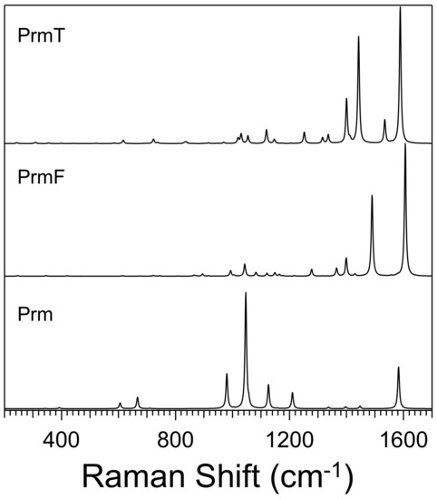 Simulated Raman spectra of pyrimidine (Prm) compared to that of PrmF and PrmT.