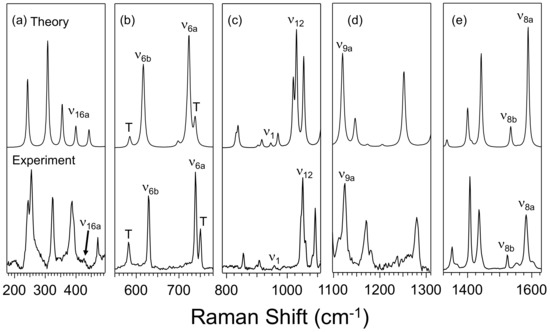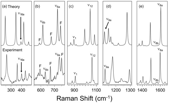 We previously showed that the out of plane puckering mode ν16a split from one peak in the liquid, to two peaks (a major and a minor) in the solid-state, but did not shift its location [44]. A comparison of the computed locations for this mode between Prm, PrmF, and PrmT, in Figure 8, predicts a slight shift to a higher energy of 2 cm−1 and 8 cm−1 when adding the furan and thiophene moieties, respectively. Comparisons of the number and intensities of features in the simulated spectra in Figure 9a and Figure 10a suggest that ν16a lies at 400 cm−1 in PrmF and 425 cm−1 in PrmT experimentally. Compared to all of the other modes in this study, ν16a exhibits the smallest degree of coupling with other motions. Other modes in the vicinity of ν16a in both PrmF and PrmT involve the motions of both rings. The most Raman active peak in PrmF in this region at 358 cm−1 involves the stretching of the covalent bond between the two rings. The same feature appears experimentally in PrmT at 324 cm−1.