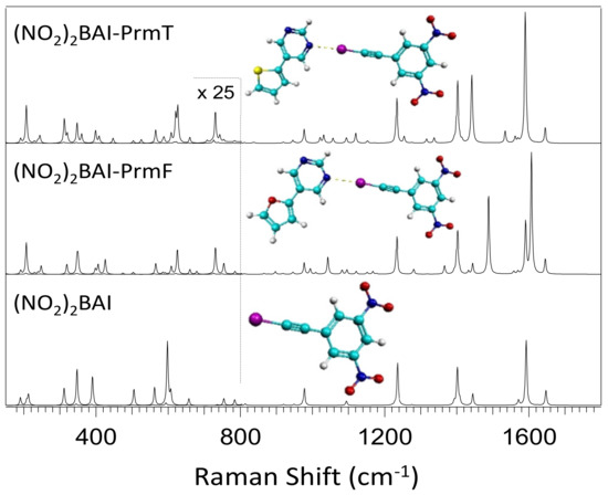 Simulated Raman spectra of (NO2)2BAI (bottom), and optimized complexes formed from (NO2)2BAI with either PrmF (middle) or PrmT (top). Raman activities below 800 cm−1 have been multiplied by a factor of twenty-five so that they can be easily visualized.