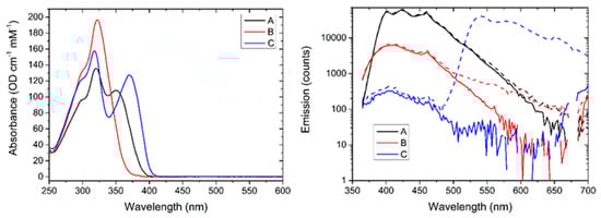 The molar attenuation spectra of the three molecules are presented in Figure 2 (left panel). The blue/UV absorption edge wavelength is the longest for “C” and shortest for “B”.