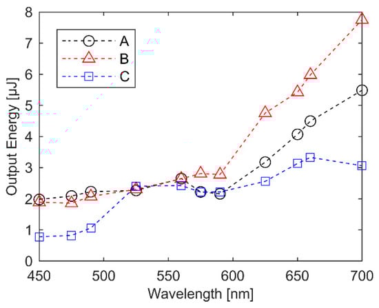 To compile the results of the wavelength-scanned OPL measurements, the cut-off level was estimated at each wavelength. This was done by doing a linear fit of the data points above an input fluence of 20 J/cm2 and reporting the estimated transmitted pulse energy at 25 J/cm2. The results are shown in Figure 3. The platinum(II)–alkynyl molecule, “C”, showed the best performance, followed by the purely organic molecule “A”. All three molecules showed similar performance around 550 nm. In the 450 nm to 500 nm wavelength range, molecule “C” showed a better cutoff level than the fairly similarly performing molecules “A” and “B”. At wavelengths above 600 nm, the cutoff level of the molecules showed a marked difference. The dibromophenyl-based molecule “B” had the highest cutoff level, while molecule “C” showed the best performance.