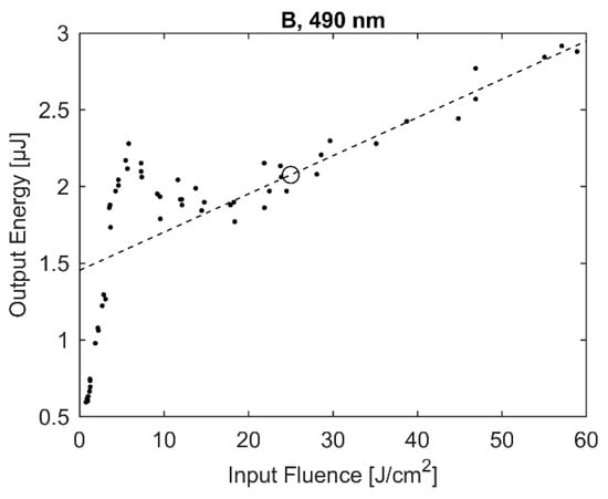 Representative OPL measurement for molecule “B” at 490 nm excitation wavelength. The dots are the measured data. The dashed line is the linear fit of the “cutoff level”, and the circle is the value used for plotting, as in Figure 3.