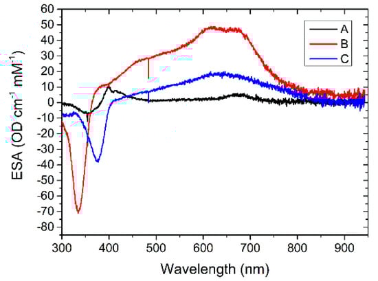 The microsecond ESA measurements are shown in Figure 5. The plots are for the largest ESA recorded with zero delay between the ns pump and the white probe flash. In the calculation of the ESA spectrum, the optical absorption spectrum of the unpumped sample was used, giving the negative UV absorption features of samples “B” and “C” in particular, which had long-lived triplet states []. For microsecond ESA, molecule “B” showed the highest absorption of the triplet state in the 600–700 nm region, followed by molecule “C”. Both the ground state bleaching and ESA were relatively weak for molecule “A”, compared to that for “B” and “C”, meaning that most of the excited molecules were relaxed to the ground singlet state within the μs excitation pulse.