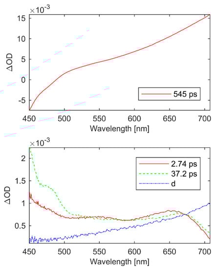 Spectral basis vectors of molecule “A” are shown in Figure 6. Three decay times were identified as 2.7 ps, 37.2 ps, and 545 ps. The long-lived 545 ps lifetime was an order of magnitude stronger in absorbance than the other decays and showed a negative signal towards the blue wavelengths.
