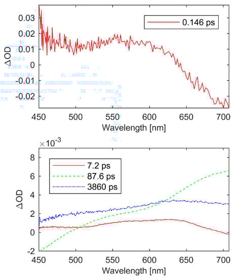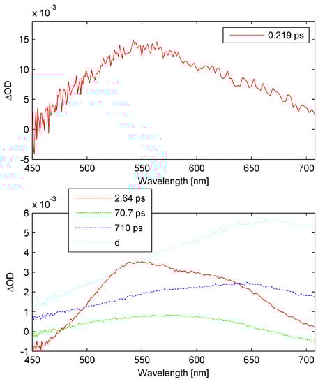For molecule “C”, the basis vectors are presented in Figure 8. Decays with time constants of 0.2 ps, 2.6 ps, 70.7 ps, and 710 ps were obtained. The quality of the subpicosecond decay fit was, as with molecule “B”, of limited quality. Furthermore, while the 2.6 ps decay was characterized by a negative amplitude near 450 nm, it was not as prominent as for the 545 ps and 87.6 ps decays obtained for molecules “A” and “B”.