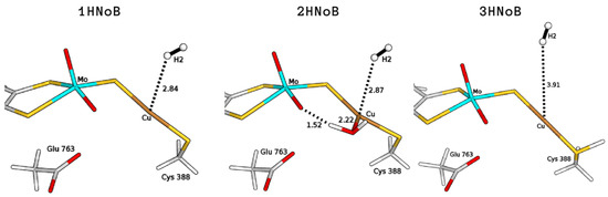 QM/MM optimised structures of intermediates where the H molecule is present in the active site but not bound to the Cu ion, considering different copper coordination modes (1HNoB, bi-coordinated; 2HNoB, tri-coordinated), active-site protonation states (3HNoB, protonated Cys388). All distances are in Å.
