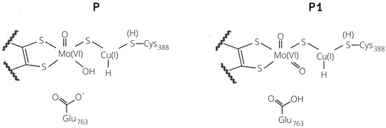 Copper–hydride complexes formed by proton extraction by means of Glu763 (P1) or Mo–O (P).