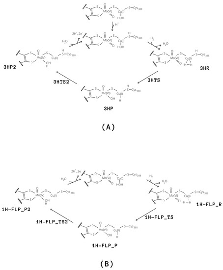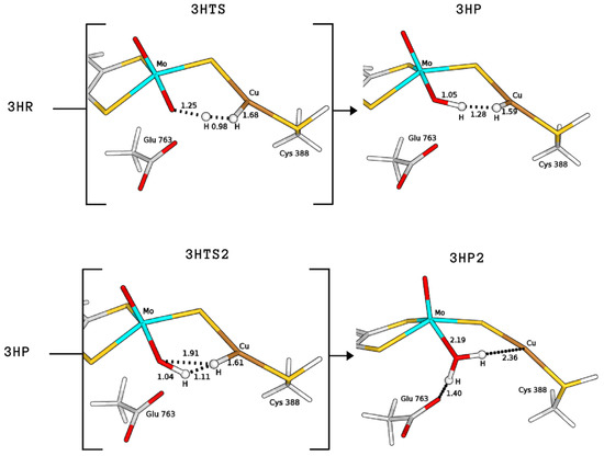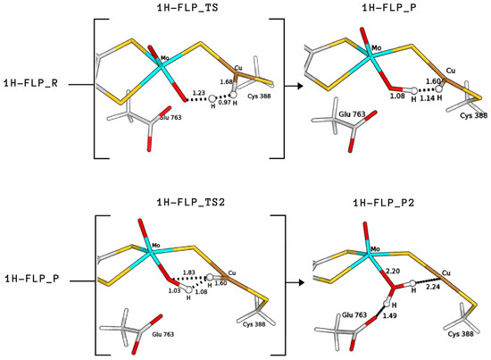 Independently of the protonation state of Cys388, our results support a mechanism in which the equatorial oxo group of Mo extracts the first proton. Such process is characterised by a rather low activation barrier that may allow a relatively rapid proton exchange, in accordance with experimental evidence [9]. However, differently from what was hypothesised in the literature [9], we propose that this rapid proton exchange is promoted by the oxo ligand on Mo, rather than by Glu763. Moreover, the equilibrium of this step favours the H reactant complex over copper hydride in both cases, as discussed by Wilcoxen and Hille in light of the pH independence of the reaction. Finally, the intermediates 3HP or 1H-FLP_P should be converted to the fully reduced form of the enzyme by the transfer of the Cu-bound hydride to the (now protonated) O, giving MoO(OH)Cu [8,13,27] (P2; see Figure 8). In both cases, the resulting reduced intermediates were found to be very stable, −90.8 and −82.8 kJ/mol for 3HP2 and 1H-FLP_P2, respectively (see Table 1 and Figure 6 and Figure 7). Moreover, the reaction barriers for the above two reactions are relatively low (28.4 and 34.7 kJ/mol, respectively). Finally, the reverse reactions are energetically impeded since the reverse activation barriers exceed 140 kJ/mol in both cases (TSs energies are and 147.2 and 161.9 kJ/mol respectively). Again, this is in good agreement with experiments, showing no production of H by the enzyme [9].