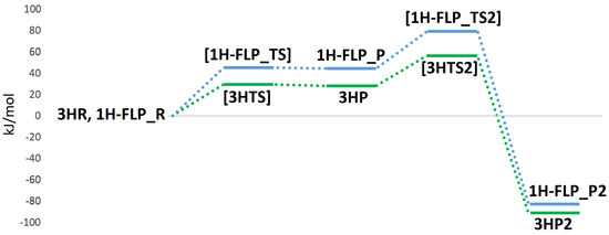 The product formed by extraction of the proton by the equatorial ligand of Mo (P) was not found in the case of 2H, whereas it corresponds to structures with a total energy difference of −2.9 and 28.0 kJ/mol with respect to the reagents for 1H and 3H, respectively (1H-FLP_P in Figure 6 and 3HP in Figure 7). 1H-FLP_P can also represent the product for the H splitting reaction starting from the 1H-FLP_R structure. In this case, the resulting Cu–hydride was found to be 44.4 kJ/mol less stable than the reagent.