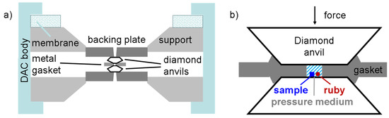 - Piermarini, G.J.; Block, S.; Barnett, J.D.; Forman, R.A. Calibration of the pressure dependence of the R1 ruby fluorescence line to 195 kbar. J. Appl. Phys. 1975, 46, 2774–2780. [Google Scholar] [CrossRef]
