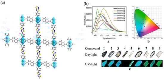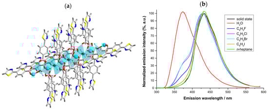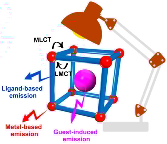 - Cepeda, J.; Rodríguez-Diéguez, A. Tuning the Luminescence Performance of Metal–Organic Frameworks Based on d10 Metal Ions: From an Inherent Versatile Behaviour to their Response to External Stimuli. CrystEngComm 2016, 18, 8556–8573. [Google Scholar] [CrossRef]