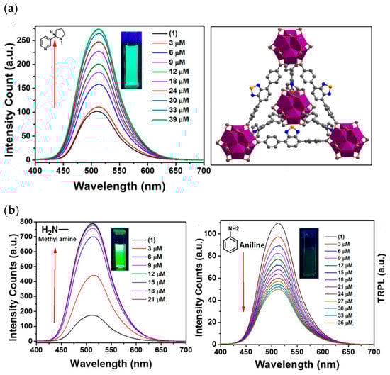 - Takashima, Y.; Martinez, V.M.; Furukawa, S.; Kondo, M.; Shimomura, S.; Uehara, H.; Nakahama, M.; Sugimoto, K.; Kitagawa, S. Molecular Decoding Using Luminescence from an Entangled Porous Framework. Nat. Commun. 2011, 2, 168. [Google Scholar] [CrossRef]