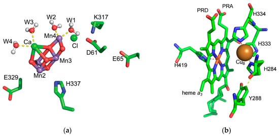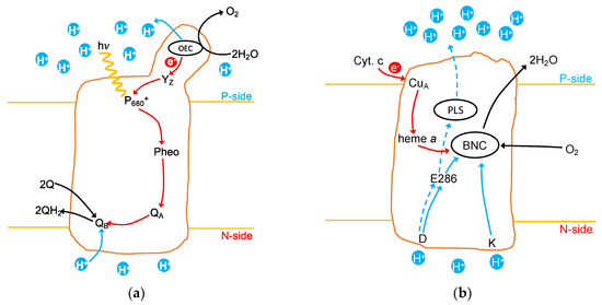 CcO (complex IV) is the terminal protein of the respiratory electron transfer chain in mitochondria and aerobic bacteria, using the electrons from cytochrome c produced in complex III, to reduce O2 to water [46,47,48,49]. CcO catalyzes the reaction that reverses the OEC chemistry, using the energy liberated in the reduction of O2 to add to the transmembrane proton gradient. However, rather than using a Mn based cofactor, the active site binuclear center (BNC) of CcO contains a heme (heme a3) and a copper (CuB) [50] (Figure 2b). While the OEC is near the P-side of the protein, the BNC is in the center so that substrate protons must move into the protein, from the N-side, to produce water. During one catalytic cycle, four electrons are transferred from cytochromes c bound at the P-side, to CuA, a bi-copper site, and then to a low-spin heme a, finally to the BNC [51]. Meanwhile, eight protons are taken up from the N-side, with four protons delivered to the BNC as needed for the oxygen chemistry (chemical protons), and four protons translocated across the membrane (pumped protons). The overall reaction is: