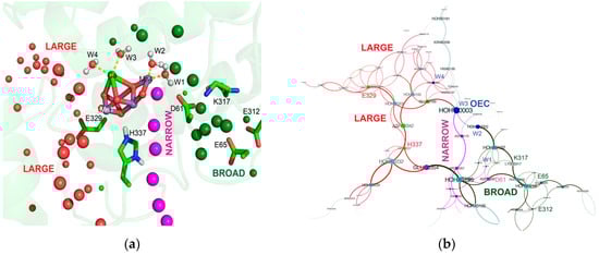 (a) Water channels around the OEC. The QM/MM hydrated, optimized S1 cluster is docked into the 3ARC [106] PSII structure. Red: large channel, pink: narrow channel; green: broad channel. (b) Hydrogen bond connections for residues in narrow, broad and large channels that are connected through cluster of water molecules as determined by MCCE network analysis [119].