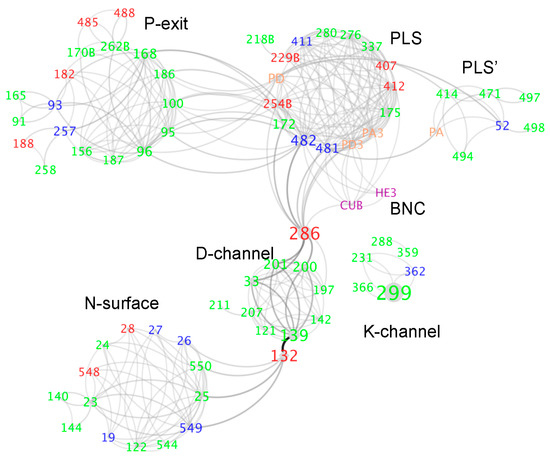 Hydrogen bond network in Rb. sphaeroides CcO [119]. The network is divided into circular clusters with well-connected residues shown as: N-surface, D-channel, K-channel, BNC, PLS, PLS’, P-exit. Residues are shown as individual nodes, labeled by residue number, followed by B to identify residues in subunit II. Heme a3 is labeled as HE3, while CuB as CUB, propionic acids of heme a3 as PA3/PD3, propionic acids of heme a as PA/PD. The labels are colored based on amino acid type; red: acid; blue: base; green: neutral polar; orange: propionic acid; purple: BNC. The larger nodes and darker edges show more important connections in the network analysis.