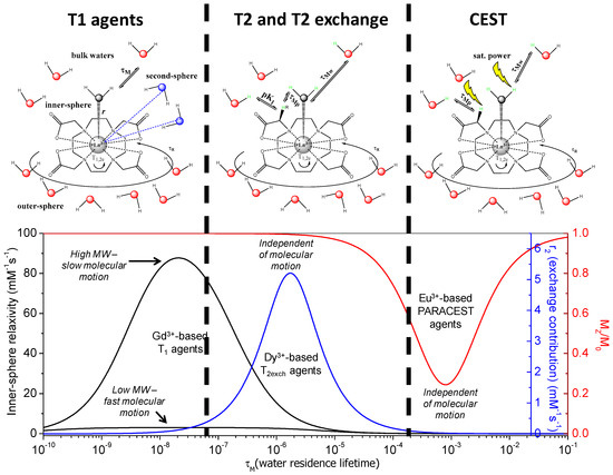 Schematic of T1, T2, T2-exchange, and chemical exchange saturation transfer (CEST) (paraCEST) lanthanide contrast agents (CAs) with one coordinated water molecule (inner-sphere water, its oxygen is colored black) in solution (bulk and outer-sphere waters, oxygens are in red). Second-sphere water molecules (water oxygens are colored blue). The parameters that govern the relaxivity are also represented: O–Ln distance (r), the mean lifetime (τM) of the water molecules in the inner sphere, the rotational correlation time (τR) and the electronic spin relaxation times (T1e and T2e). Below, the corresponding simulated plots are represented, showing the contrast effect (r1, r2, Mz/M0) vs. the τM, assuming standard parameters from the literature.