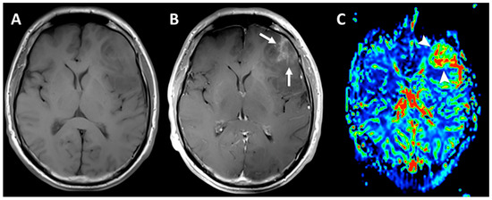 Axial T1-weighted (A) post-contrast axial T1-weighed FSE acquisition. (B) A focal region of heterogeneous enhancement (white arrows) indicating disruption of the blood–brain barrier, a finding usually seen in malignant gliomas. Dynamic susceptibility contrast (DSC) perfusion images were also acquired. During the first pass, a Gd-based CA to explore the T2* effects and post-processed rCBV map (C) demonstrates a focal area of markedly increased tumor vascularity (arrowheads) matching the area of enhancement. This area was targeted for stereotactic biopsy, which confirmed the suspicion of an anaplastic glioma. Reproduced with permission from [6].