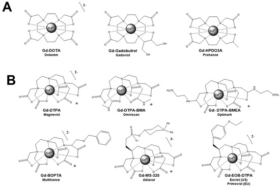 Schematic representation of Gd3+-based contrast agents commercially approved and used in the clinic: (A) polyaza macrocycles, (B) linear aminopolycarboxylates. Corresponding overall charges represented at the top right corner of each agent. All the agents are coordinated to one water molecule that is not represented here, for simplicity. CAs labeled with * were suspended by the European Medicines Agency due to concerns over nephrogenic systemic fibrosis. Note that all starred agents are linear, not macrocyclic, compounds.