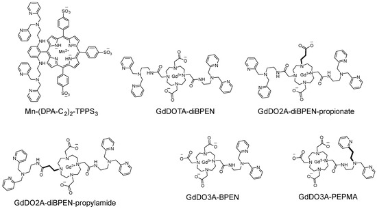 Chemical structures of some zinc-responsive MRI contrast agents applied in vivo. The typical strategy for creating these agents is to add a zinc-responsive N,N-bis(2-pyridyl-methyl)ethylenediamine (BPEN) ligand to the macrocyclic ring. Altering the alkane chain linking nitrogen atoms alters the binding constants of zinc, resulting in different responsiveness.