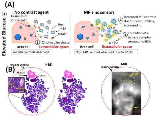 Schematic illustrating the phenomenon observed in vivo from β-cells during glucose-stimulated zinc/insulin secretion: insulin (brown spheres) and Zn2+ (cyan spheres) release. Ternary complex highlighted in yellow and blue (right) (A). Histological staining; islets labelled in red (B) (left). MRI of slice of tissue showing functional zinc release from the β-cells in the islets in the presence of the low affinity zinc sensor GdDO3A-PEPMA (B) (right). Adapted with permission from [12]. Copyright 2018 American Chemical Society.