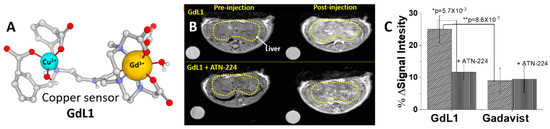 (A) Copper-responsive MRI contrast agent, shown chelating a Cu2+ ion. (B) First in vivo demonstration of a copper-responsive MRI contrast agent (Images are from a mouse liver, both with (bottom) and without (top) pre-treatment with ATN-224, a Cu2+ chelator. Notice the bright enhancement in the top-left frame after injection of the contrast agent, and the decrease in brightness on the bottom left frame after injection of the contrast agent after ATN-224 treatment, indicating enhancement is due to the presence of copper ions. Since this agent is not expected to cross the cell membrane, copper ions are likely in the extracellular space (C) quantitative signal intensity changes of the copper-responsive MRI contrast agent (GdL-1), compared to Gadavist, with and without the presence of ATN-224. Adapted from [51].