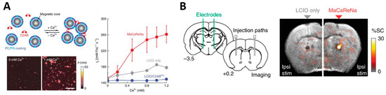 - Okada, S.; Bartelle, B.B.; Li, N.; Breton-Provencher, V.; Lee, J.J.; Rodriguez, E.; Melican, J.; Sur, M.; Jasanoff, A. Calcium-dependent molecular fMRI using a magnetic nanosensor. Nat. Nanotechnol. 2018, 13, 473. [Google Scholar] [CrossRef]