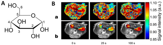 (A) Haworth projection of d-glucose. (B) Transverse relaxation data from a dynamic in vivo glucose infusion experiment on a mouse. T2-weighted images of mouse kidneys from the time of a glucose bolus infusion are displayed (time indicated below each image). (a) Effects in all regions displayed. (b) Only kidney signal displayed in color on grayscale image to highlight effects. Adapted with permission from [78].