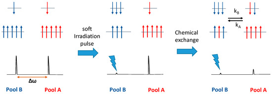 Schematic representation of the distribution of proton spins and the simulated NMR spectra when a pre-saturation pulse is applied, and the system is under a chemical exchange. As a result, a negative contrast is produced by the difference of chemical exchange in between pools; this is known as CEST.