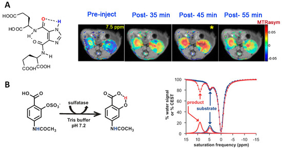 With the introduction of the CEST technique, sugars, amino acids, and another low-molecular-weight diamagnetic (diaCEST) molecules with exchangeable protons, such as –NH and –OH groups have been tested as contrast agents. Often, these agents are low molecular weight compounds with high biocompatibility. Glucose and iopamidol are two diaCEST agents that have been approved for intravenous administration, and are currently under study in human clinical trials [80,81]. Other successful examples with in vivo applications include a new pH-sensitive diaCEST agent (an imidazole-4,5-dicarboxamide) which displays a CEST signal at 7.8 ppm from water, with improved sensitivity and specificity compared to existing agents (i.e., gluCEST and APT CEST agents; Figure 10A) [82,83,84,85]. In addition, this probe is strongly pH-dependent, which allowed the successful measurement of the pH of a mouse kidney (Figure 10). This behavior has already found to agree with the acid–base properties of imidazole-4,5-dicarboxamides [83]. A potential application of diaCEST agents is the in vivo monitoring of enzyme catalysis, in which an enzyme either inactivates or deactivates a target molecule by modulating the exchangeable protons (CatalyCEST MRI) [86]. An example of a target enzyme is sulfatase [86]. Although various methods are used to study sulfatases in vitro, an in vivo sensor may help to understand the biological role of these enzymes. Sulfatase dysfunction is associated with numerous pathologies, including developmental abnormalities, hormone-dependent cancer, and bacterial infection [87]. Salicylic acid has been shown to produce a remarkable CEST signal at a frequency of 9 ppm relative to water frequency (also known as the chemical shift, in which the chemical shift of water is defined as δ = 0 ppm in MRI studies) [88,89]. As shown in Figure 10, the enzymatically cleaved salicylic acid derivative (4-acedamido-2-(sulfoxy)benzoic acid) eliminates the CEST signal at 5 ppm from the pre-cleaved salicylic acid proton (Figure 10B, blue CEST spectrum), and generates a CEST signal at 9 ppm (Figure 10B, red CEST spectrum) [83]. This “activation” of the CEST signal is used to detect sulfatase enzyme activity. Also, to improve detection specificity, an aryl amide ligand (at 5 ppm) that would be unresponsive to sulfatase activity has been introduced to the structure, and thereby serves as an internal control. These CEST spectra were produced from HEK293 human embryonic cell line, which is known to express extracellular sulfatase enzymes [90]. Properties, including relatively higher sensitivity to the local biological environment, biocompatibility, higher solubility, and non-toxicity, make these diaCEST agents a promising group of MRI contrast agents with excellent potential for clinical translation [91].
