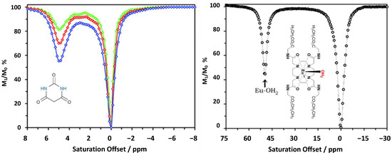 CEST spectra of 125 mM (blue), 62.5 mM (red), and 31.25 mM (green) solutions of barbituric acid (diaCEST agent) recorded at 300 MHz, pH 7.0 and 37 °C (left). The CEST spectra of a 30 mM solution EuDOTA-4AmCE3+ (paraCEST agent) recorded at 270 MHz and 25 °C; the peak at +50 ppm reflects exchange with the coordinated “bound” water molecule (right). Adapted with permission from [92].
