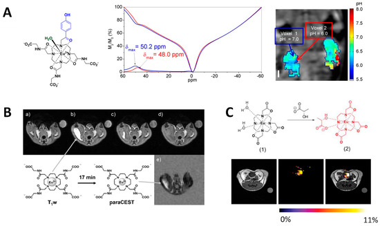 (A) The structure of the pH responsive agent (left), fitted CEST spectra (right) with MTRasym profiles for two different single voxels from the left kidney, as indicated in the CEST pH map (right). (B) T1w and CEST imaging of an intramuscular injection of Eu-DOTA-gly4 complex into the thigh muscle of a healthy male C57BL/6J mouse at B0 = 9.4 T. T1w images at (a) pre-injection, (b) 5 min, (c) 12 min, (d) 16 min, and (e) the CEST image at 17 min. (C) The structure of EuDO3A (top), axial view of T1-weighted proton MRI, the CEST image, and the overlay image of a mouse after iv injection of 0.105 mmol/kg EuDO3A and lactate (bottom). The CEST image of the bladder shows that the intact lactate·EuDO3A complex is present at 45 min after iv injection (n = 3). The CEST image represents amplitude differences between images collected after a 14 μT presaturation pulse of 5 s duration at ±43 ppm. Adapted with permission from [96,97,98].